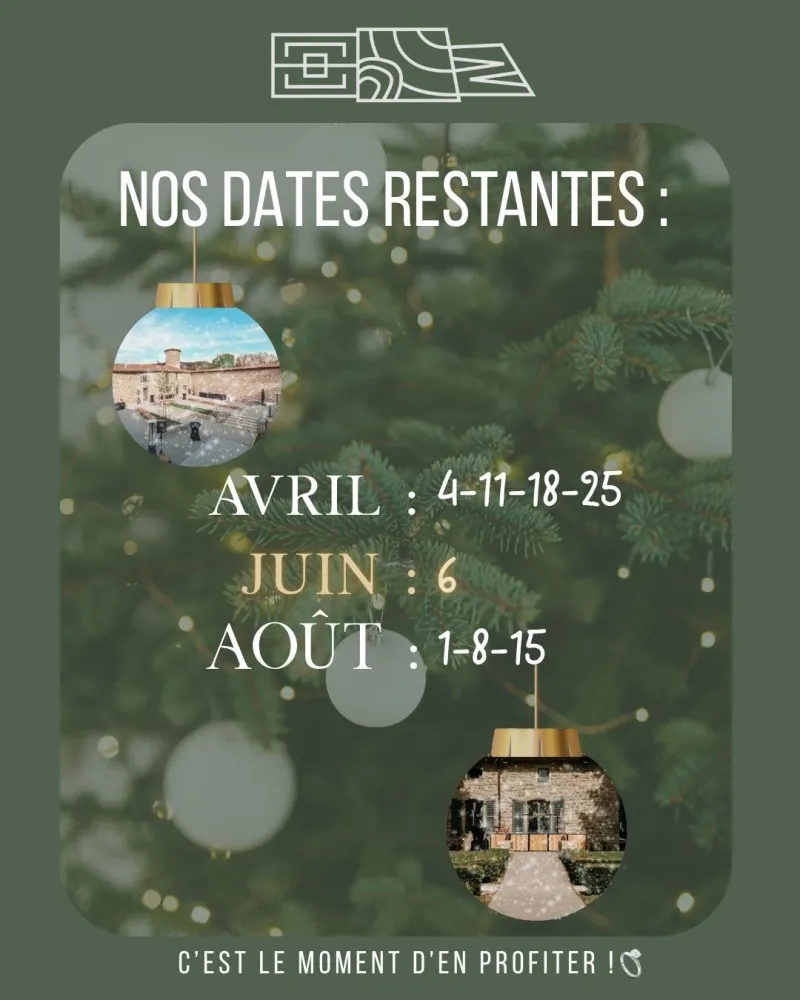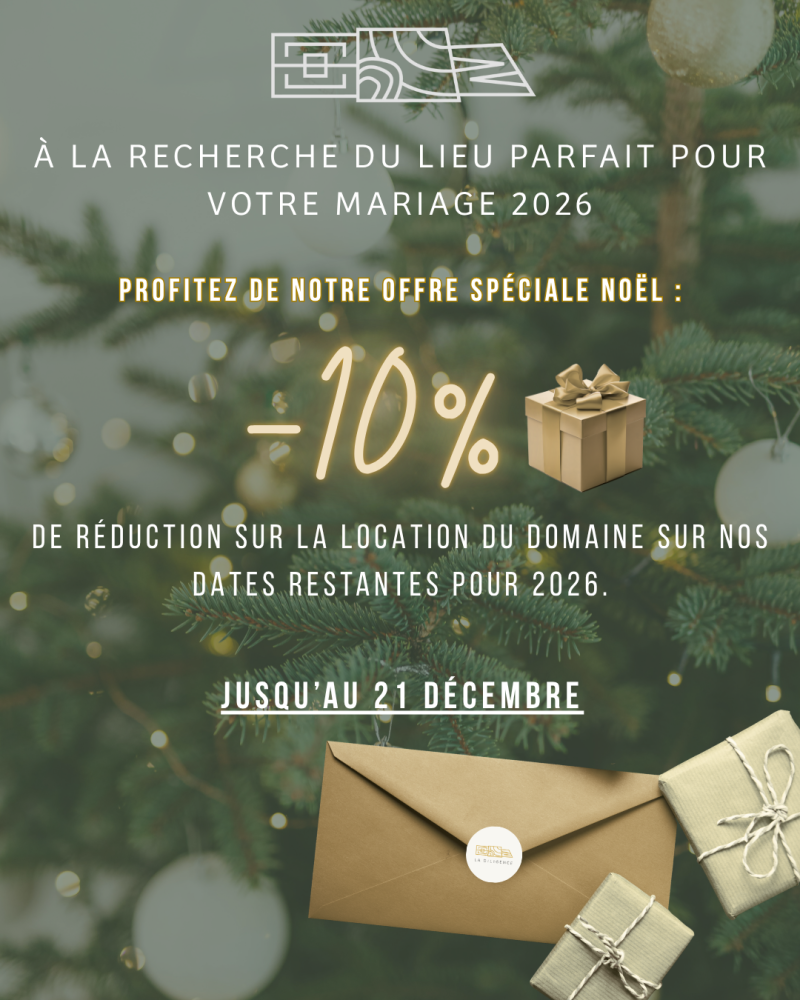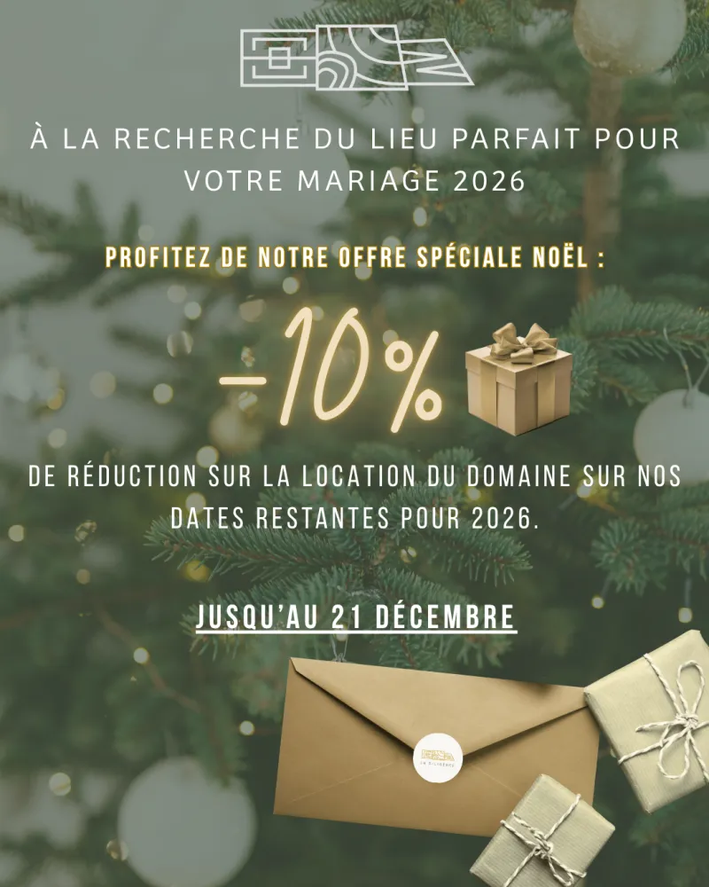 🎁Pour célébrer les fêtes, nous vous offrons –10% sur la location du Domaine sur nos dernières dates disponibles en 2026, offre pour une signature de contrat jusqu’au 21 décembre 2025.